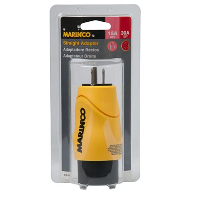 Adaptateur droit de 15A-125V mâle à 30A-125V femelle. Construction robuste. Note: Recommandé pour endroit sec car ne contient pas de collet d'étanchéité.
