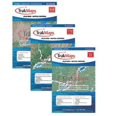 Map of the St Lawrence River from Trois-Rivières to Quebec City with bathymetry (depth) and surrounding topography represented in colourful 3D. Includes buoy localization, nautical safety tips, guidelines and navigational information. The TRAK Nautical Atlas is convenient and practical for boaters with Its laminated pages in an easy to handle size. Format :Laminated booklet (12 pages, spiral binding) Scale of 1:40000
