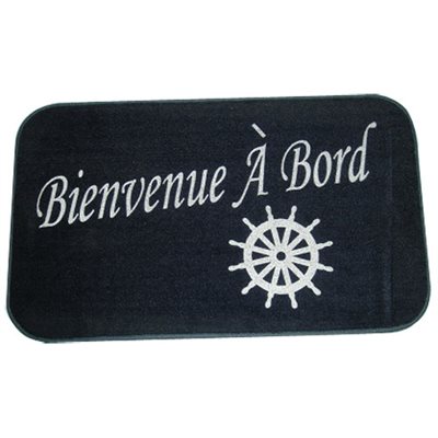 Tapis Bienvenue à bord . 100% acrylique. Lavable à la machine. Couleur marine avec lettrage blanc.