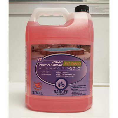 Antigel pour plomberie 3,78 L protection de -51 °C. Non toxique. Ne pas utiliser pour les moteurs. Biodégradable.